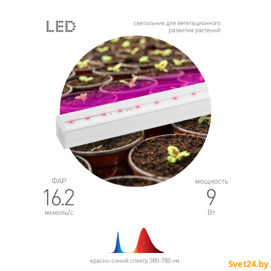 Светильник для растений ЭРА FITO-9W-Т5-N предназначен для выращивания зелени, рассады пасленовых, а также для досвечивания комнатных цветов. Спектр свечения светильника фиолетовый со сдвигом в розовую часть; соотношение синего к красному - 2 к 3. Сдвиг в область красного с добавлением свечения в области дальнего красного позволяет светильнику обеспечить питание корням и листьям и предотвратить вытягивание растений. Данная модель отличается прозрачным рассеивателем, крепким корпусом с хорошим теплоотводом. Диоды в светильнике работают в дефорсированном режиме, что обеспечит его долгий срок службы и хорошую светоотдачу. Рекомендованное расстояние от светильника не более 35 см до листьев растений. Минимальное расстояние не менее 5 см. Подвес светильника легко регулировать по высоте с помощью бечевки и комплекта скоб. Мощность светильника рассчитана на площадь подоконника соответствующей длинны. Увеличение расстояние между растениями и светильником уменьшает эффект от использования обратно пропорционально квадрату расстояния. Аккуратный и лаконичный дизайн позволит модели легко вписаться в интерьер балкона или кухни. Главные преимущества линейной фитолампы установка, которая не займет много времени, и равномерно распределенный свет. Свечение от нее совершенно безопасно для человека и животных. Корпус модели выполнен из прочного пластика. Кроме озвученных выше достоинств, Вы можете дополнительно докупить еще несколько моделей и подключить их в цепь. Это станет отличным решением для тех, у кого много рассады. В упаковке также Вы найдете провод для подключения к сети, защитный колпачок и крепления. Подходит таймер FITO-LINETIME, штекер тройной. Светодиодная лампа для растений это долговечность и экономия затрат на электроэнергию. Создайте для любимых растений комфортные условия, а себя обеспечьте большим урожаем вместе с фитолампой ЭРА!