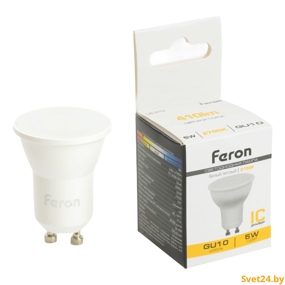Лампа светодиодная FERON LB-272, MR11 (рефлекторная), 5W 175-265V GU10 2700К (белый теплый), рассеиватель матовый белый, 410Lm, угол рассеивания 120°, 45*35мм